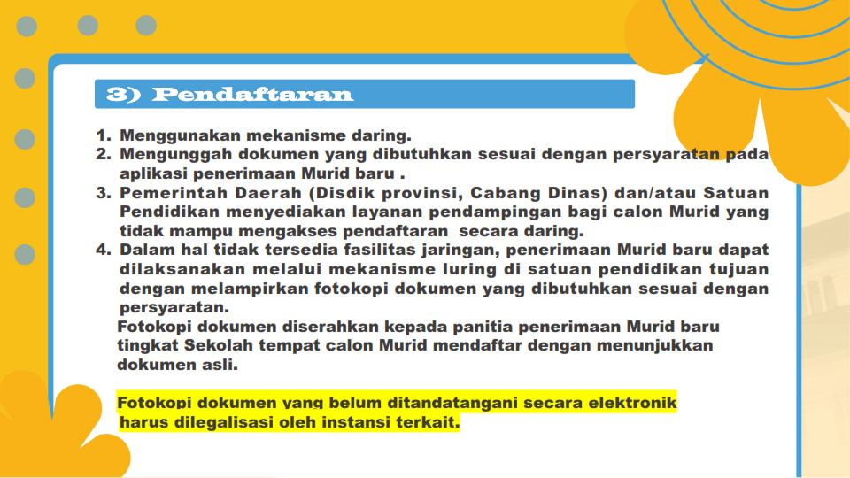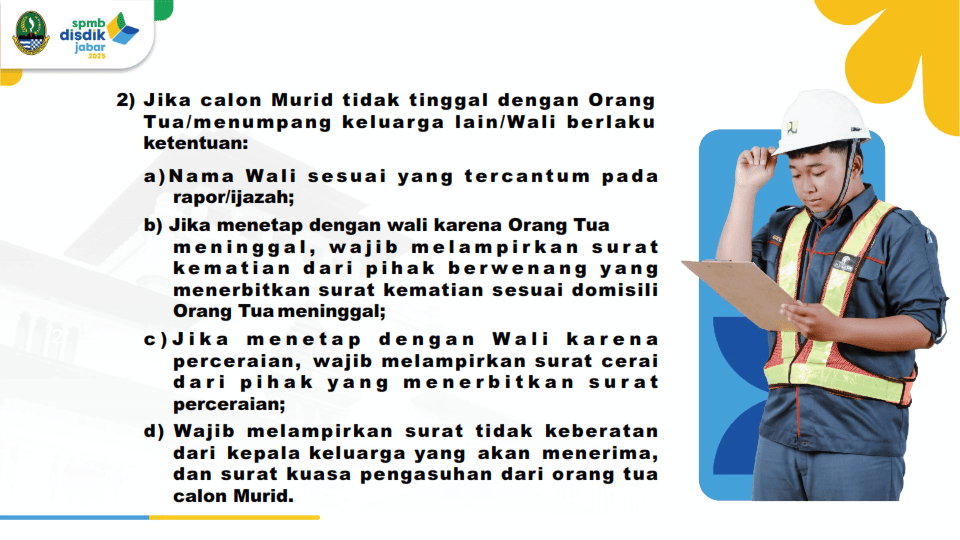 1. jika orang tua Calon murid telah meninggal dunia, hal ini harus dibuktikan dengan status almarhum/almarhumah pada kolom orang tua di kartu keluarga atau dengan surat keterangan kematian atau akta kematian.